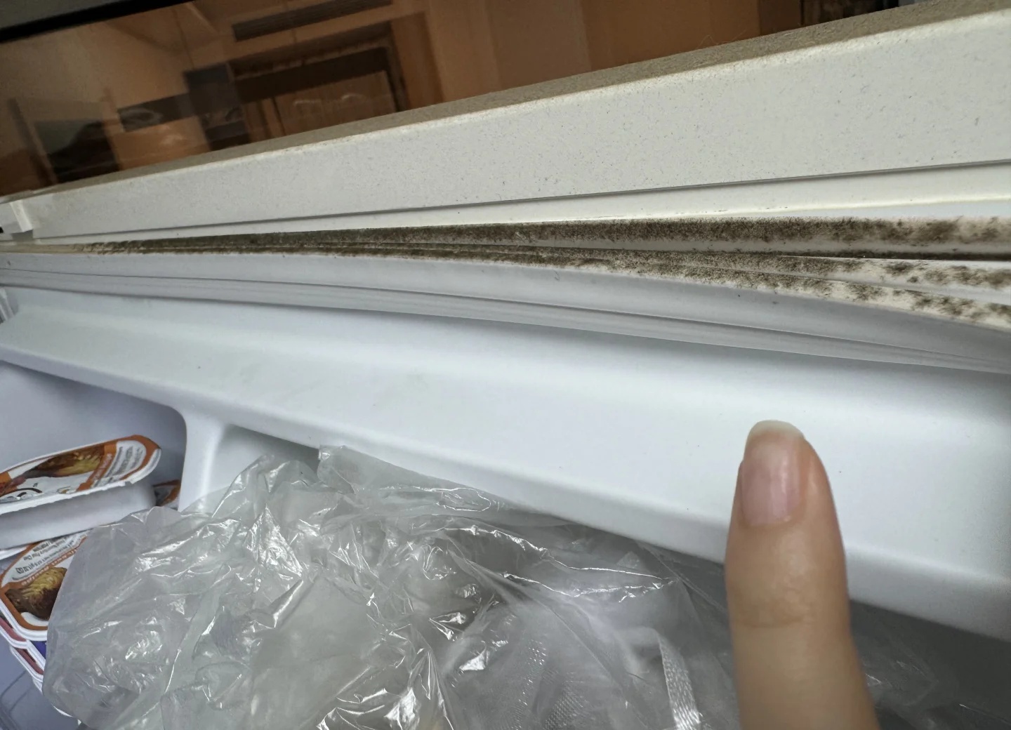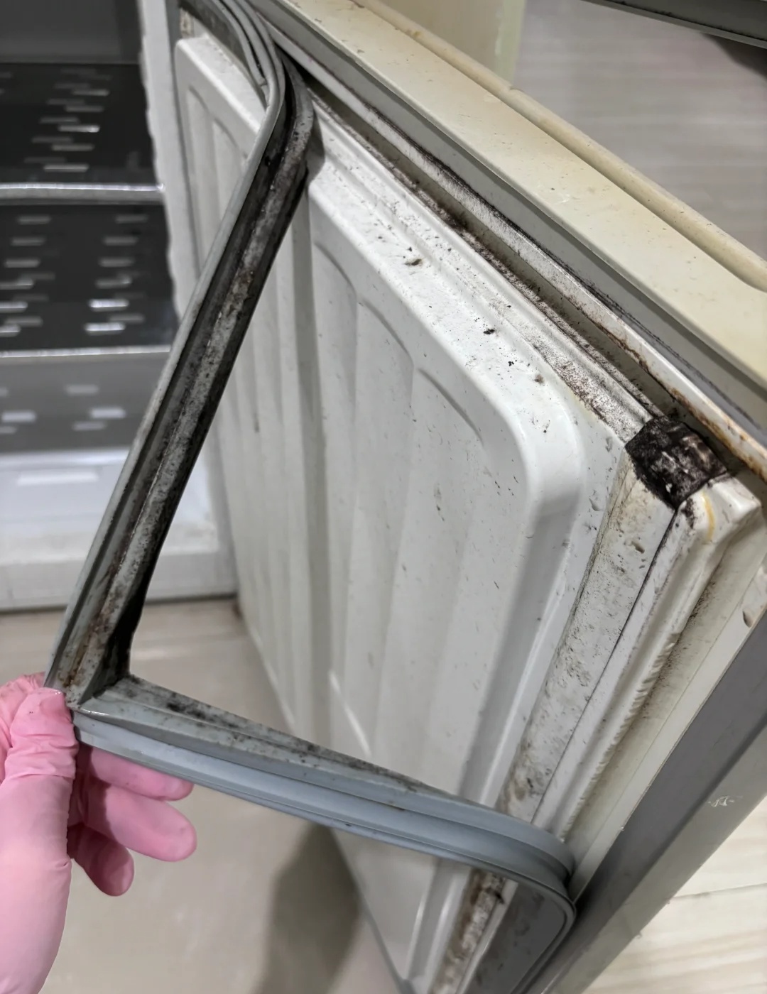 除了洗衣机的密封胶圈,还有一个隐秘的地方,那就是冰箱的密封胶条,冰箱的最外层有一圈密封胶条是用来隔绝室内与室外的温度,这套密封胶条也是非常容易发霉的,因为冰箱内部本身环境就比较潮湿,