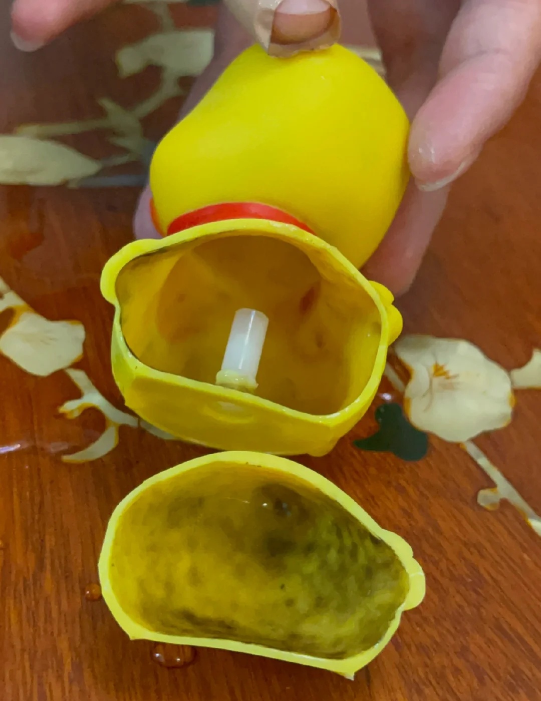 时间长了处在这种潮湿的环境当中就会容易发霉,特别是像这种小黄鸭,剪开之后看一看,里面已经滋生了大量霉菌。如果继续给孩子使用,可想而知危害有多大。