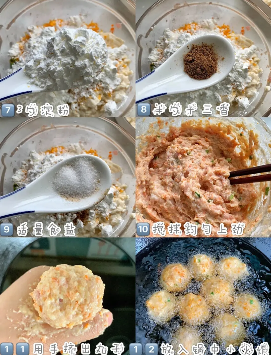 肉馅拌好后应该是比较粘稠的,如果稀了可以加些淀粉,干了则可以加鸡蛋调节。炸丸子时,一定要等它们定型后再翻动,这样炸出来的形状才会更加饱满、好看。咱这豆腐丸子不光好吃,营养价值也是杠杠的!豆腐富含植物蛋白,能为咱们补充能量,还低脂肪,吃多了也不怕胖;瘦肉提供优质动物蛋白,助力身体成长修复;胡萝卜含有丰富的维生素 A 和膳食纤维,既能保护眼睛,又能促进肠道蠕动。这三者一结合,营养全面,全家老小都爱吃。